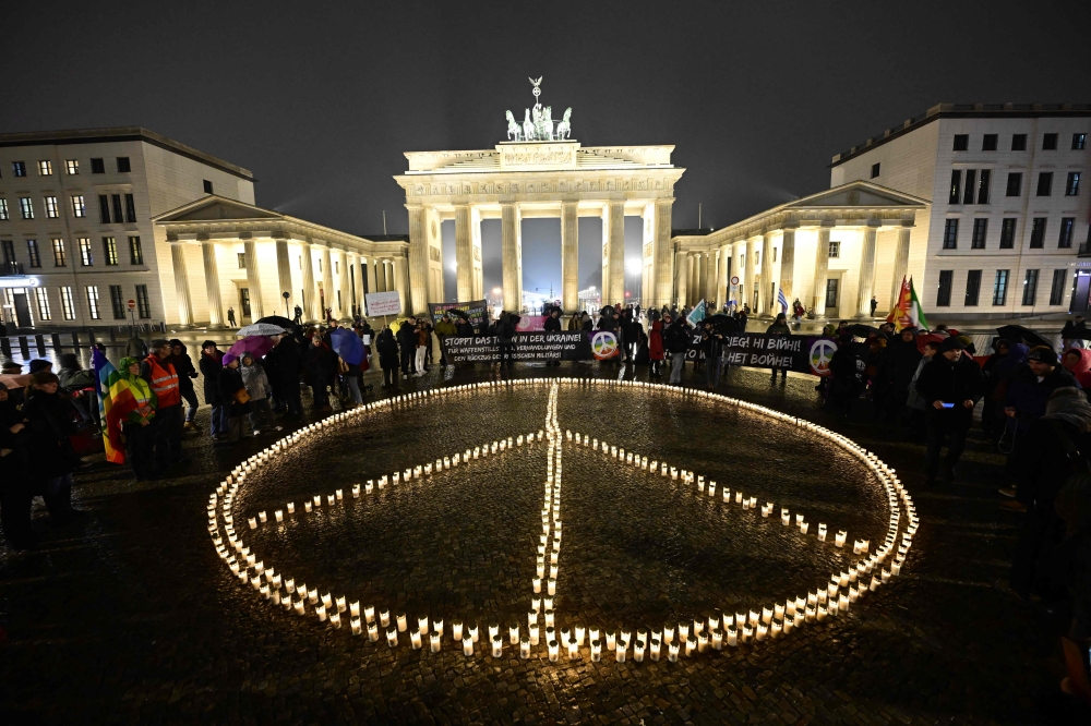 A giant peace sign is formed with candles in front of the Brandenburg Gate in Berlin marking the anniversary of Russia's invasion of Ukraine a year ago on February 23, 2023. (Photo by Tobias Schwarz / AFP)