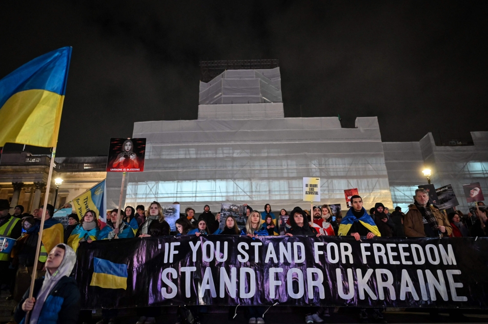 People wave Ukrainian flags and hold a banner as they attend a vigil in Trafalgar Square, central London, on February 23, 2023 to mark one year anniversary of Russia's invasion of Ukraine. (Photo by Justin Tallis / AFP)