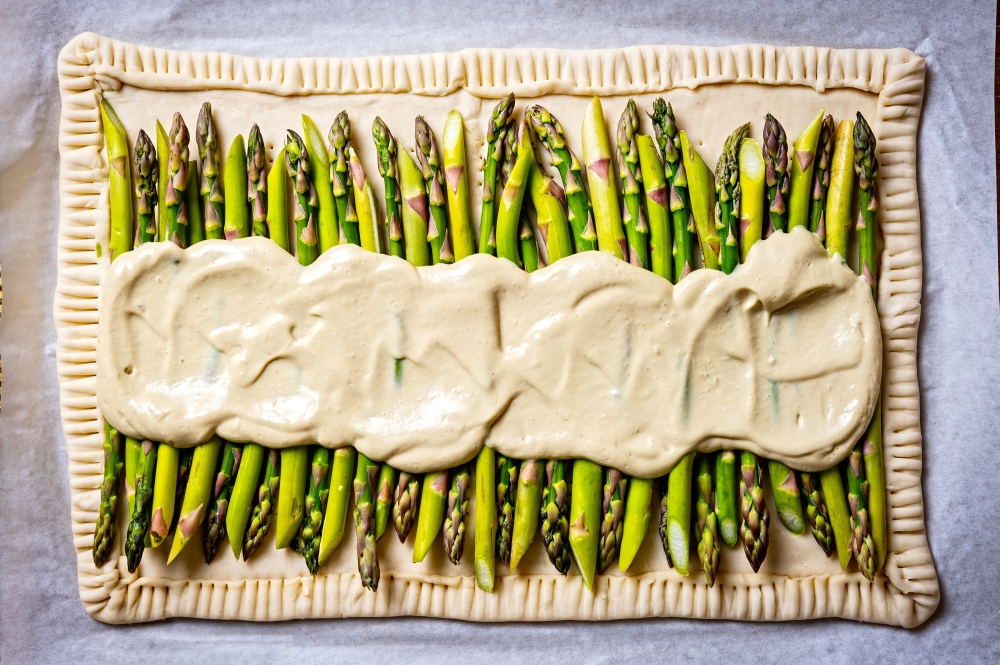Arrange the asparagus on the pastry sheet in a single row, with the spears parallel to the short sides and alternating the direction the tips point, leaving the 1/2-inch border bare. Leaving the tips and ends of the spears exposed, spoon the dressing in a wide ribbon down the center of the spears. Sprinkle the parmesan over the dressing and exposed asparagus.