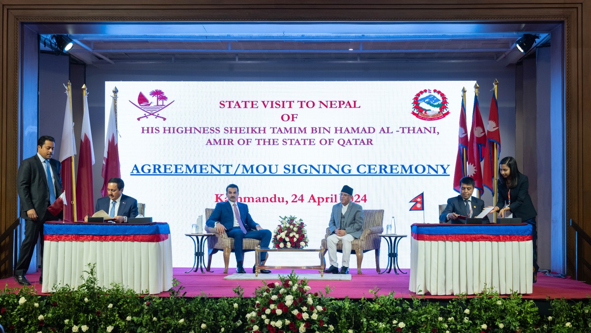 Doha, Qatar: The Amir His Highness Sheikh Tamim bin Hamad Al Thani, and His Excellency Pushpa Kamal Dahal, the friendly Prime Minister of Nepal, witnessed today, April 24, 2024, the signing ceremony of a number of agreements, memorandums of understanding and cooperation between the governments of the two countries.