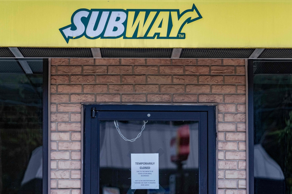 (FILES) A “Temporarily Closed” sign hangs in the door of a Subway in Centreville, Maryland, on August 23, 2023. (Photo by Jim WATSON / AFP)