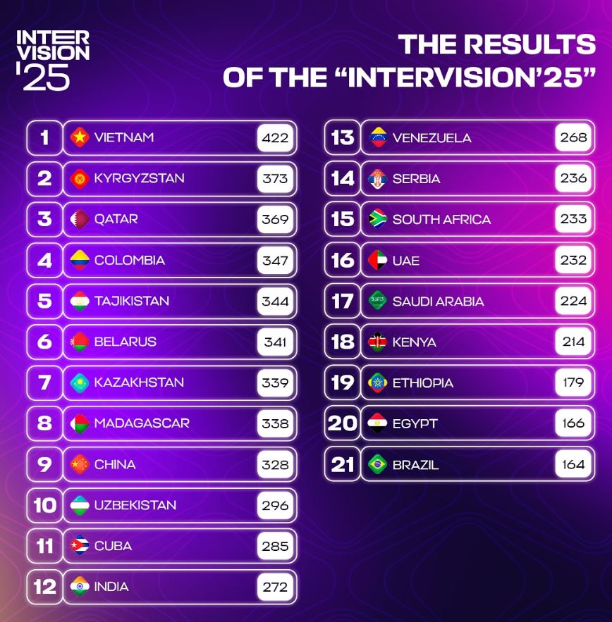 The inaugural Intervision Song Contest in Russia featured artists from over 20 countries, including the UAE, Saudi Arabia, China, Kenya, and South Africa. The international jury, composed of music experts from each participating country, awarded first place to Vietnamese singer Duc Phuc, while Kyrgyz trio NOMAD secured second.