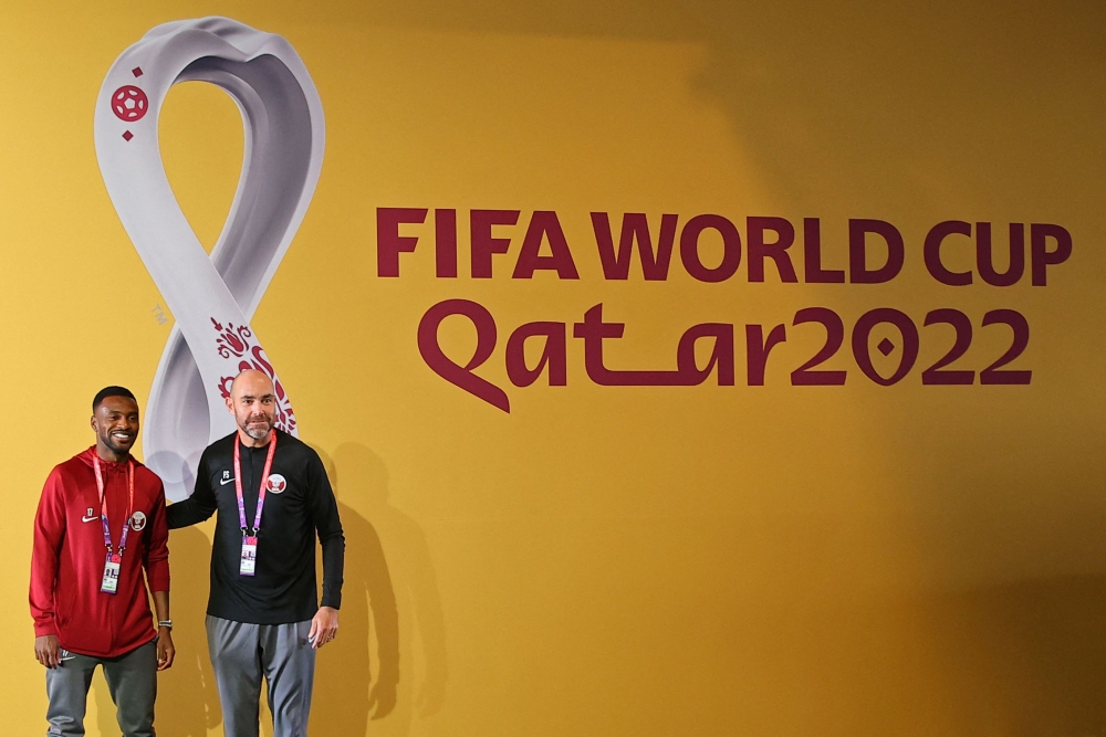 Qatar's Spanish coach Felix Sanchez (right) and Qatar's defender Ismaiel Mohammed pose for a photograph ahead of a press conference at the Qatar National Convention Center (QNCC) in Doha on November 24, 2022, on the eve of the Qatar 2022 World Cup football match between Qatar and Senegal. (Photo by KARIM JAAFAR / AFP)