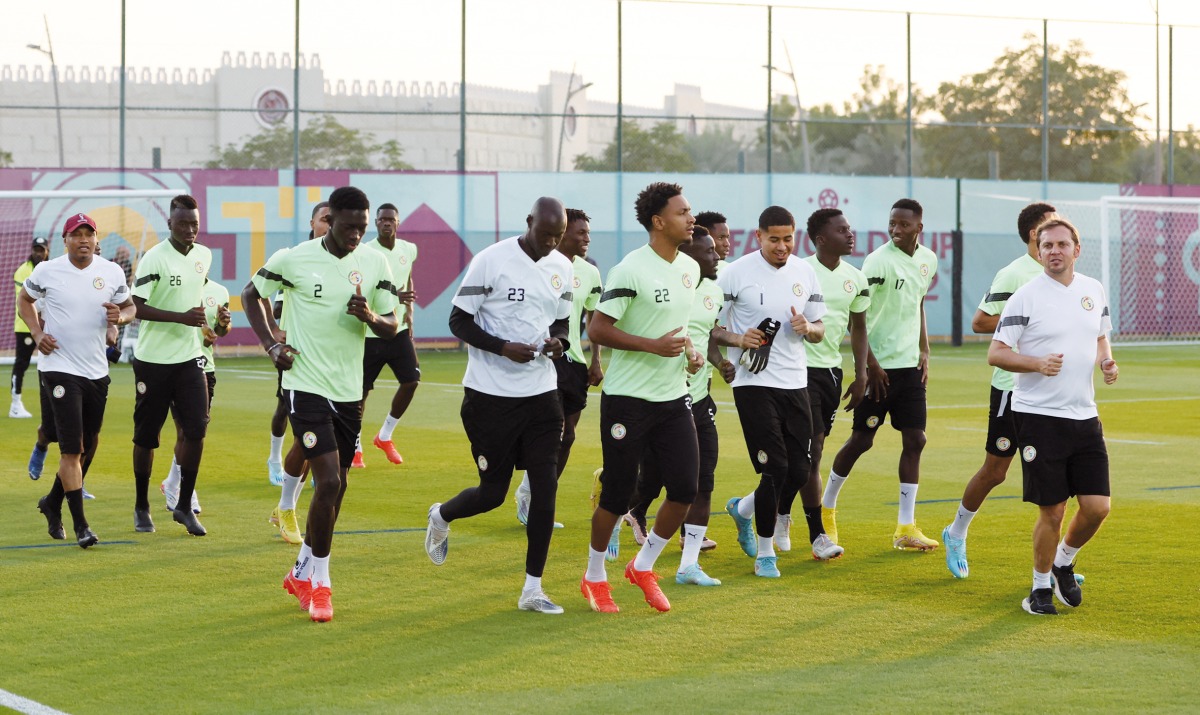 Senegal’s players including goalkeeper Edouard Mendy (centre) take part in a training session at Duhail SC yesterday.