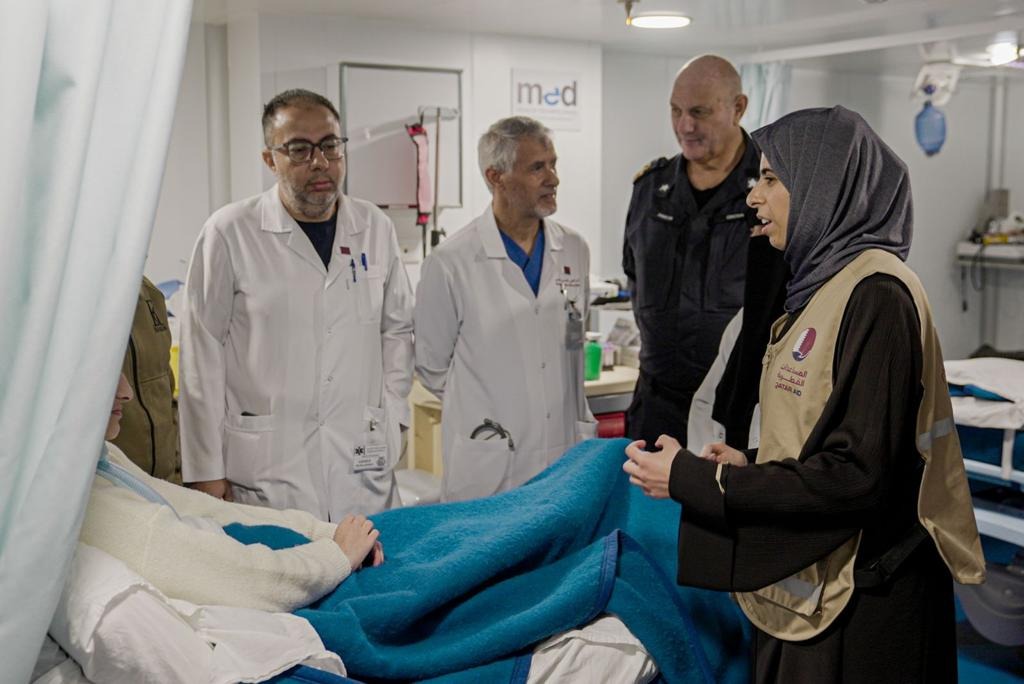Al Arish: Minister of State for International Cooperation at the Ministry of Foreign Affairs HE Lolwah bint Rashid Al Khater and the accompanying delegation checked on the wounded Palestinian brethren who are receiving treatment with the assistance of the Qatari Armed Force's medical staff 'duty troop' on the Italian Navy hospital ship "Volcano" in Al Arish port.
