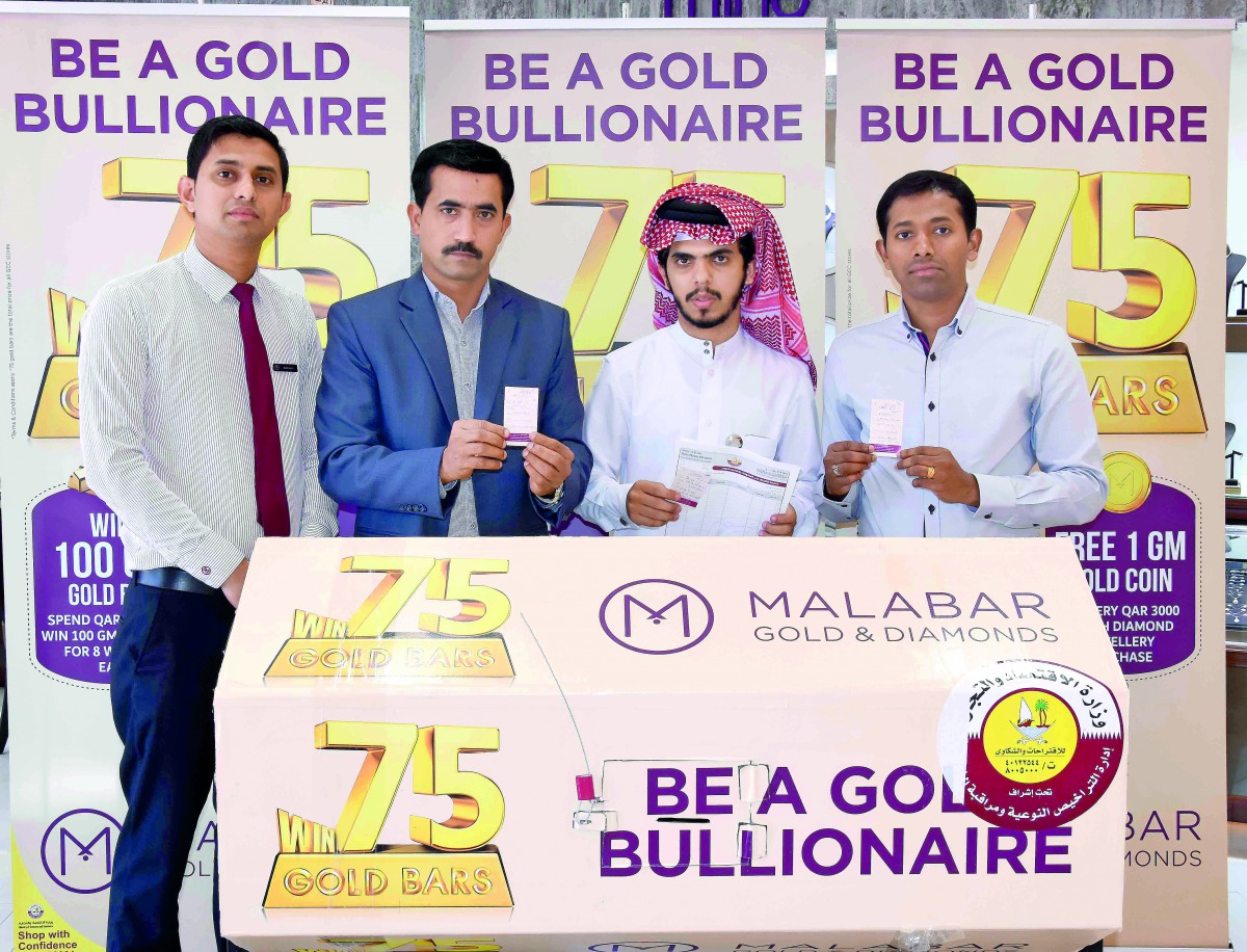 Malabar Gold & Diamonds announced the raffle draw winners of their ongoing campaign ‘Win up to 75 Gold Bar & Be A Gold Bullionaire’ in the presence of Ali Mohd Al Marri of the Ministry of Business & Trade; Santhosh T V, Regional Head of Malabar Gold & Diamonds; Raju T Johny, Deputy Branch Head; and other management team members of Malabar Gold & Diamonds. The winners are Abhay, MMM Rizvi and Mohd Nishal and all have won the prize of 100 grammes of gold.