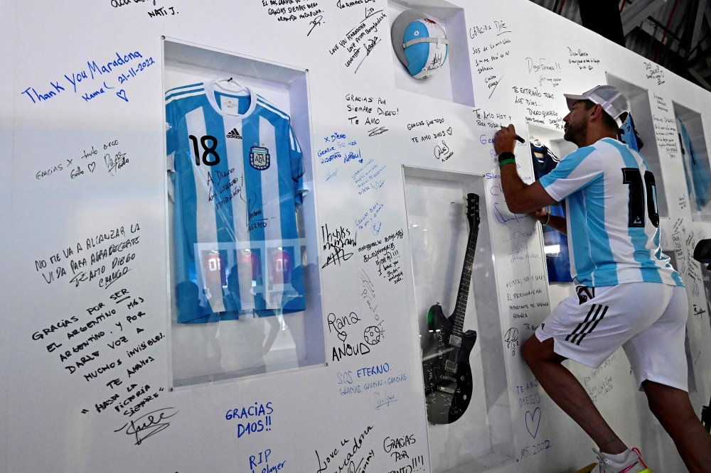 A fan of Argentina's Diego Maradona signs his name as he pays tribute on the second anniversary of Maradona's death at a fan zone devoted to the Argentine at Doha's international airport on November 25, 2022. (Photo by JAVIER SORIANO / AFP)