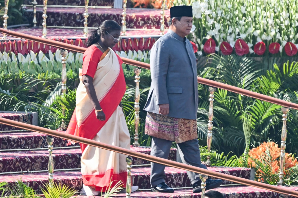 India's President Droupadi Murmu (L) with guest of honour, Indonesian President Prabowo Subianto (R) after attending Republic Day parade in New Delhi on January 26, 2025.