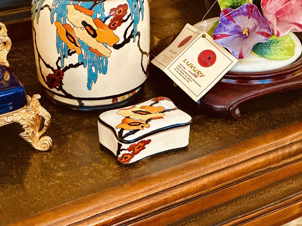A pair of a ring box and a jar from 1917 at Esam Alhijji's booth at Good Finds Market.