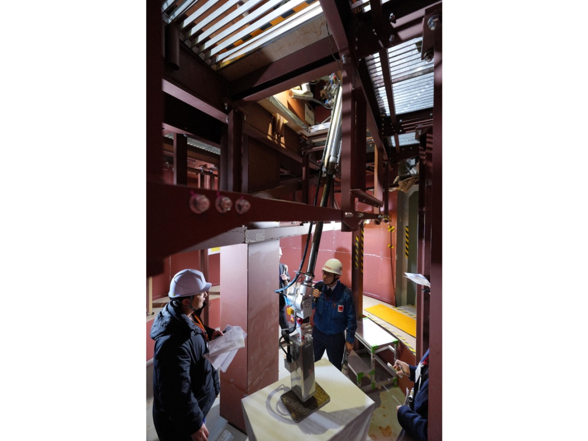 The tip of a robotic arm demonstrates the removal of melted nuclear fuel debris from the No. 2 reactor during a simulation. (Photo by Japan Pool / JIJI Press / AFP)