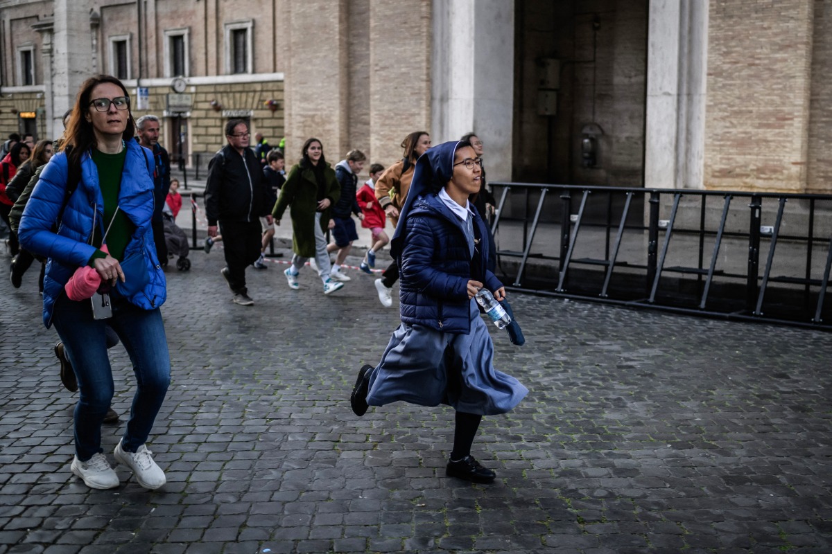 A nun runs to get a seat as she arrives near the Vatican ahead of late Pope Francis' funeral, in Rome on April 26, 2025. Photo by Jeff Pachoud / AFP