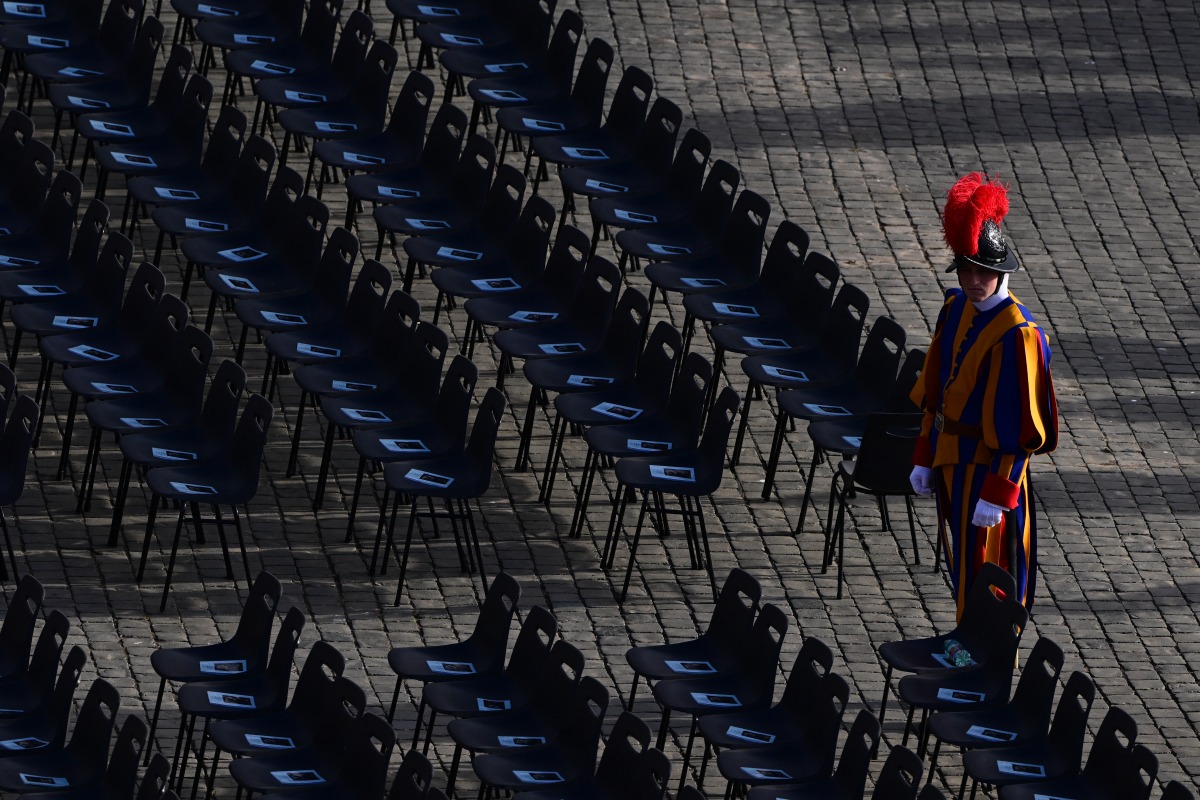 A Swiss guard stands next to chairs at St Peter's Square ahead of late Pope Francis' funeral in the Vatican on April 26, 2025. Photo by Tiziana Fabi / AFP