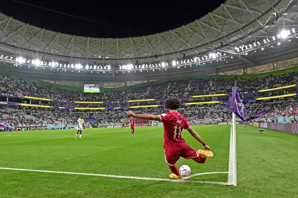Qatar's Akram Afif takes a corner kick during the Qatar 2022 World Cup Group A football match between Qatar and Senegal at the Al-Thumama Stadium in Doha on November 25, 2022. (Photo by Glyn Kirk / AFP)