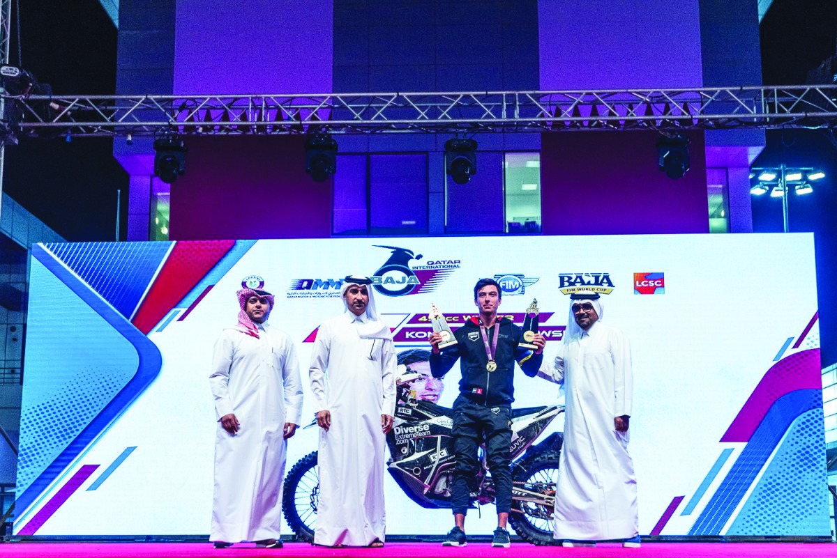 FIM Motorcycles category winner Konrad Dabrowski poses for a photo with QMMF President Abdul Rahman bin Abdul Latif Al Mannai, QMMF's Executive Director Amro Al Hamad and an official.
