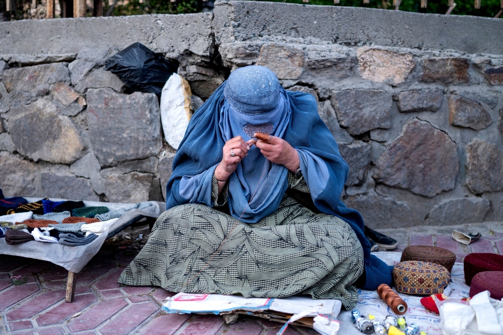 An Afghan burqa-clad woman weaves as she waits for customers along a road in Kabul on March 27, 2025. (Photo by Wakil Kohsar / AFP)