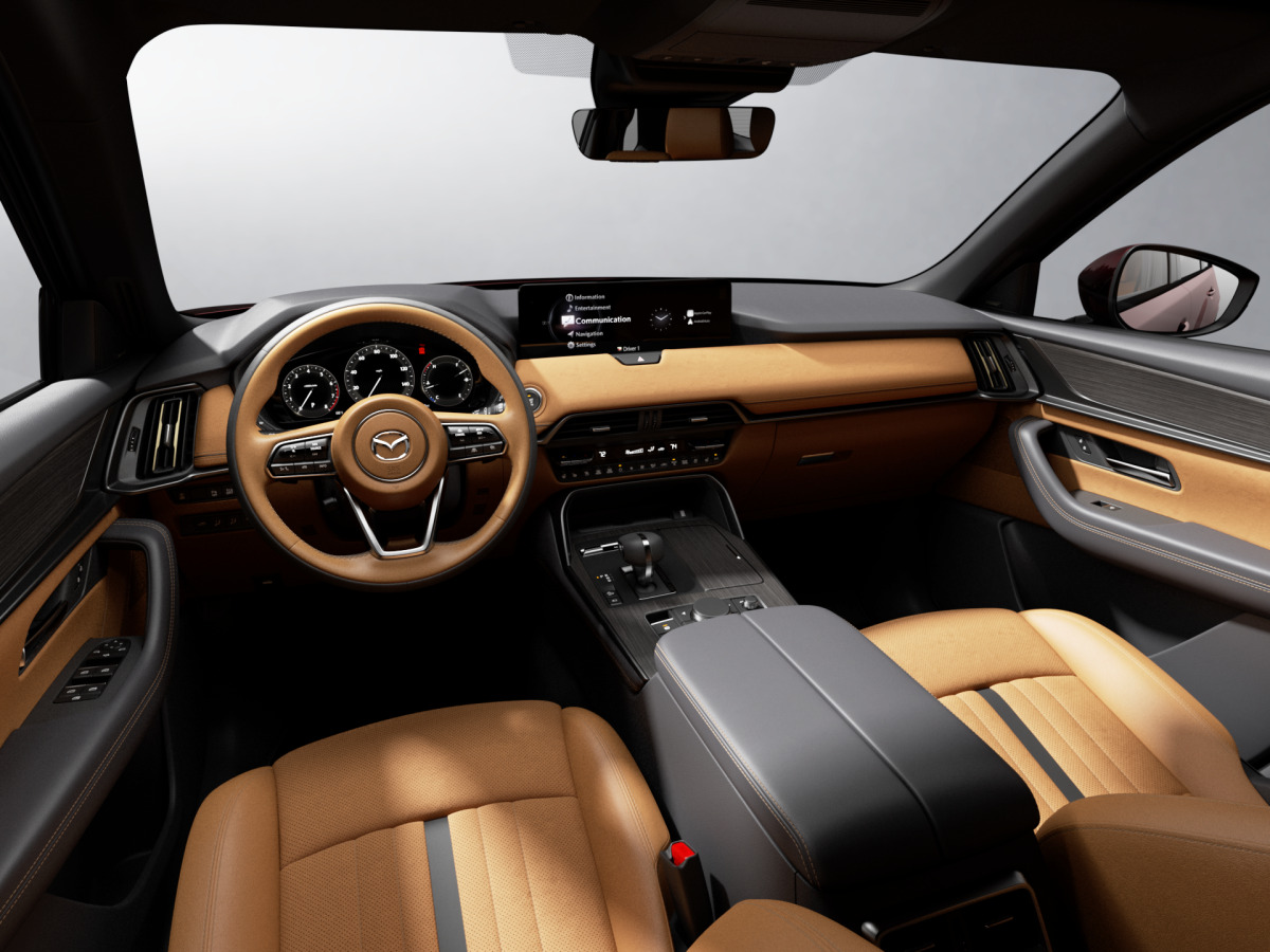 At the top of the CX-90 model lineup, the CX-90 3.3 Turbo Premium Plus completes the experience by blending first-class craftsmanship and design with Mazda’s world-class performance. This six-passenger configuration offers second row captain’s chairs with a center console, while also adding heated seats. Additionally, ventilated seats are provided for both the front and second row. Elevating the interior cabin, Nappa leather seats are equipped in new tan quilting or white Japanese Premium options. The interior trim is wrapped with an inviting, suede-like fabric with unique hanging stitches, which is specifically inspired by hand-bookbinding and an intricate Japanese weaving technique known as Kakenui, on the dash. Lastly, new two-tone leather wrapped steering wheel, maple wood trim, and upgraded front and rear foot lighting balance the dignified interior to give the driver and all occupants an elevated experience in the CX-90.
