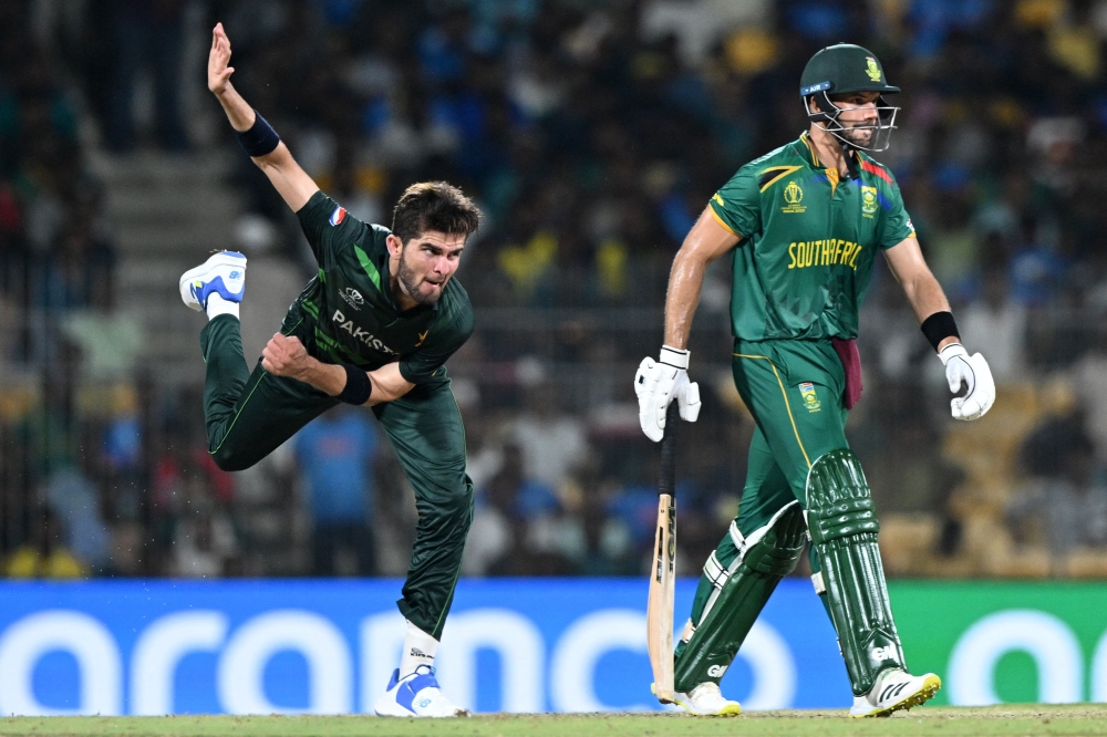 Pakistan's Shaheen Shah Afridi (left) bowls as South Africa's David Miller watches during the 2023 ICC Men's Cricket World Cup one-day international (ODI) match between Pakistan and South Africa at the MA Chidambaram Stadium in Chennai on October 27, 2023. (Photo by R.Satish BABU / AFP)