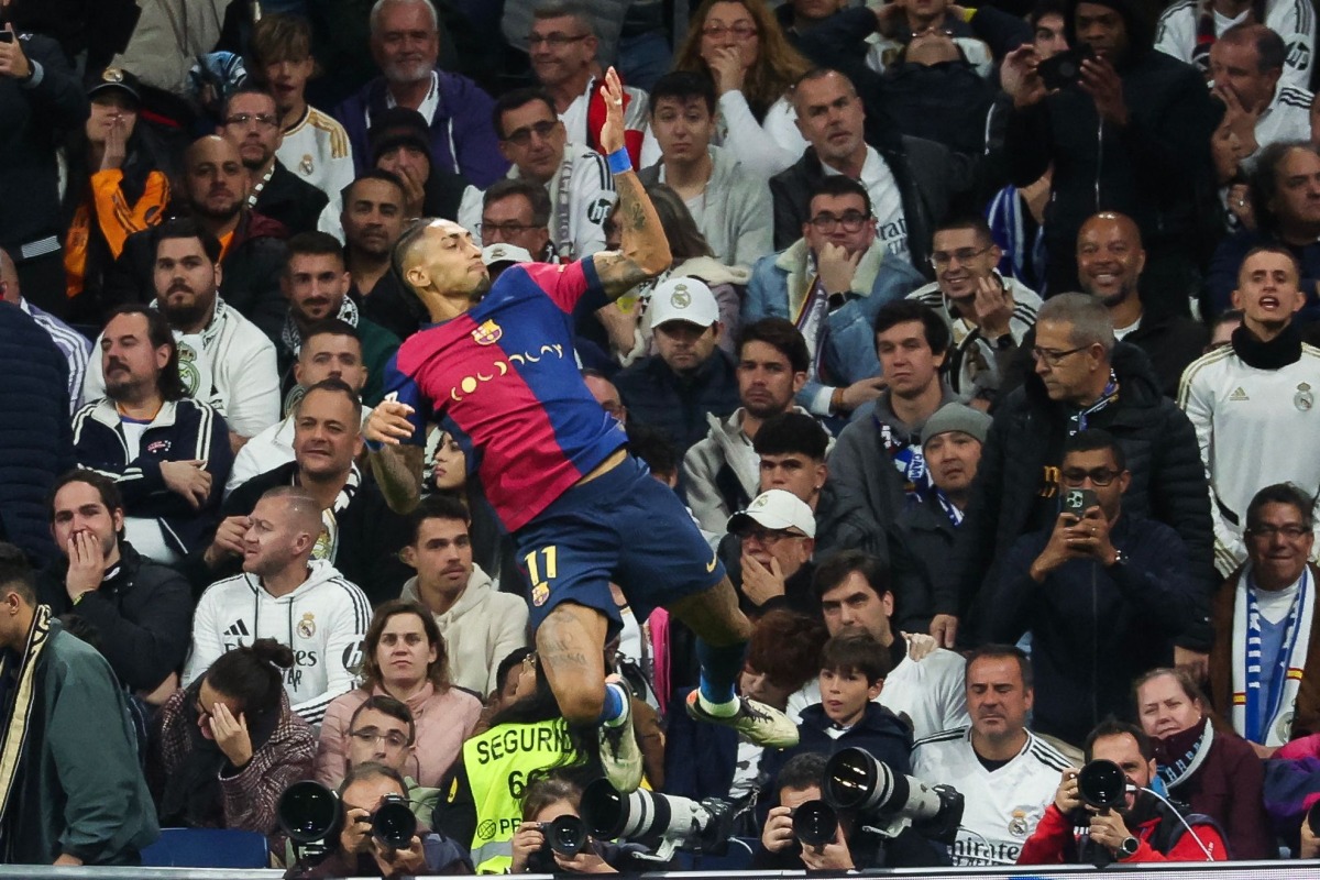 Barcelona's Brazilian forward #11 Raphinha celebrates scoring their fourth goal during the Spanish league football match between Real Madrid CF and FC Barcelona at the Santiago Bernabeu stadium in Madrid on October 26, 2024. (Photo by Pierre-Philippe MARCOU / AFP)