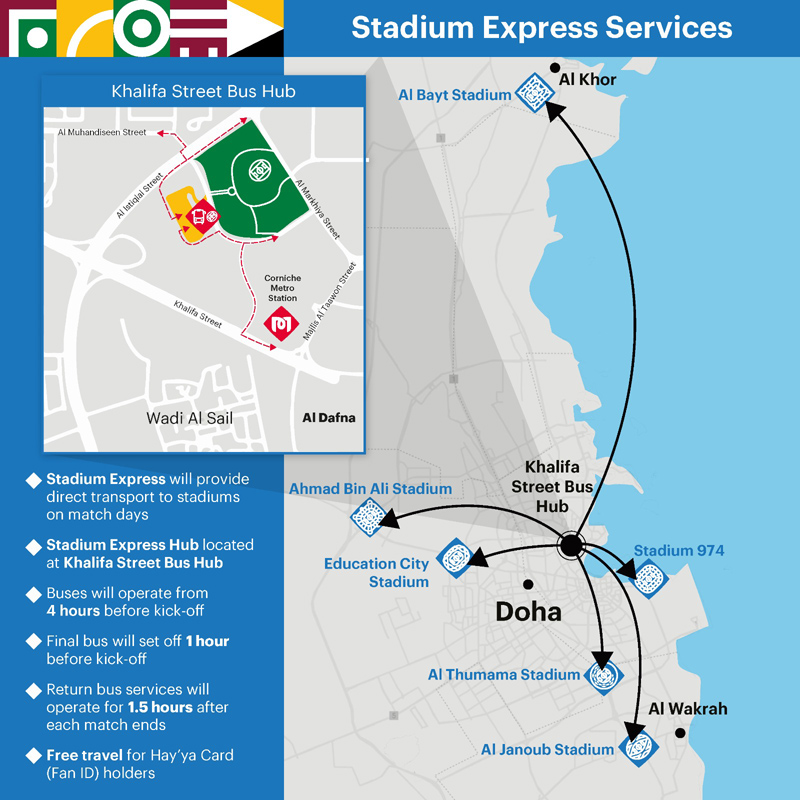 It said that Stadium Express will provide direct transport to stadiums on match days from the Stadium Express Hub located at Khalifa Street Bus Hub.