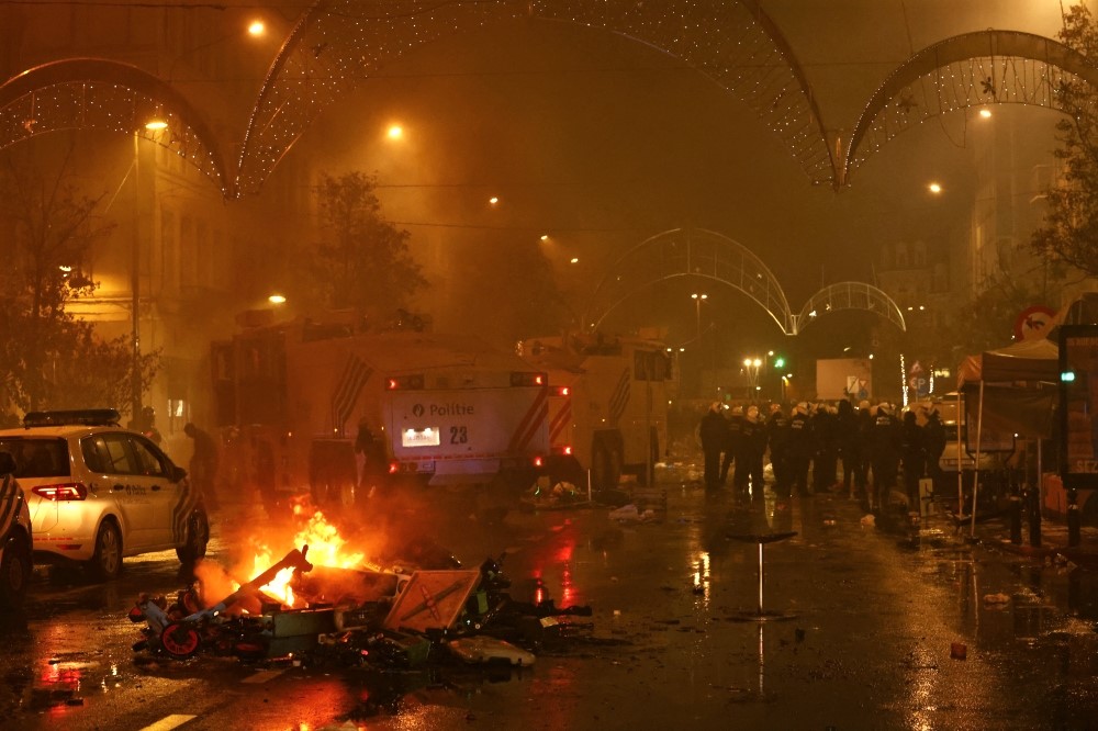 General view of people clashing with the police in Brussels, after the World Cup match between Belgium and Morocco on Sunday. (REUTERS/Yves Herman)