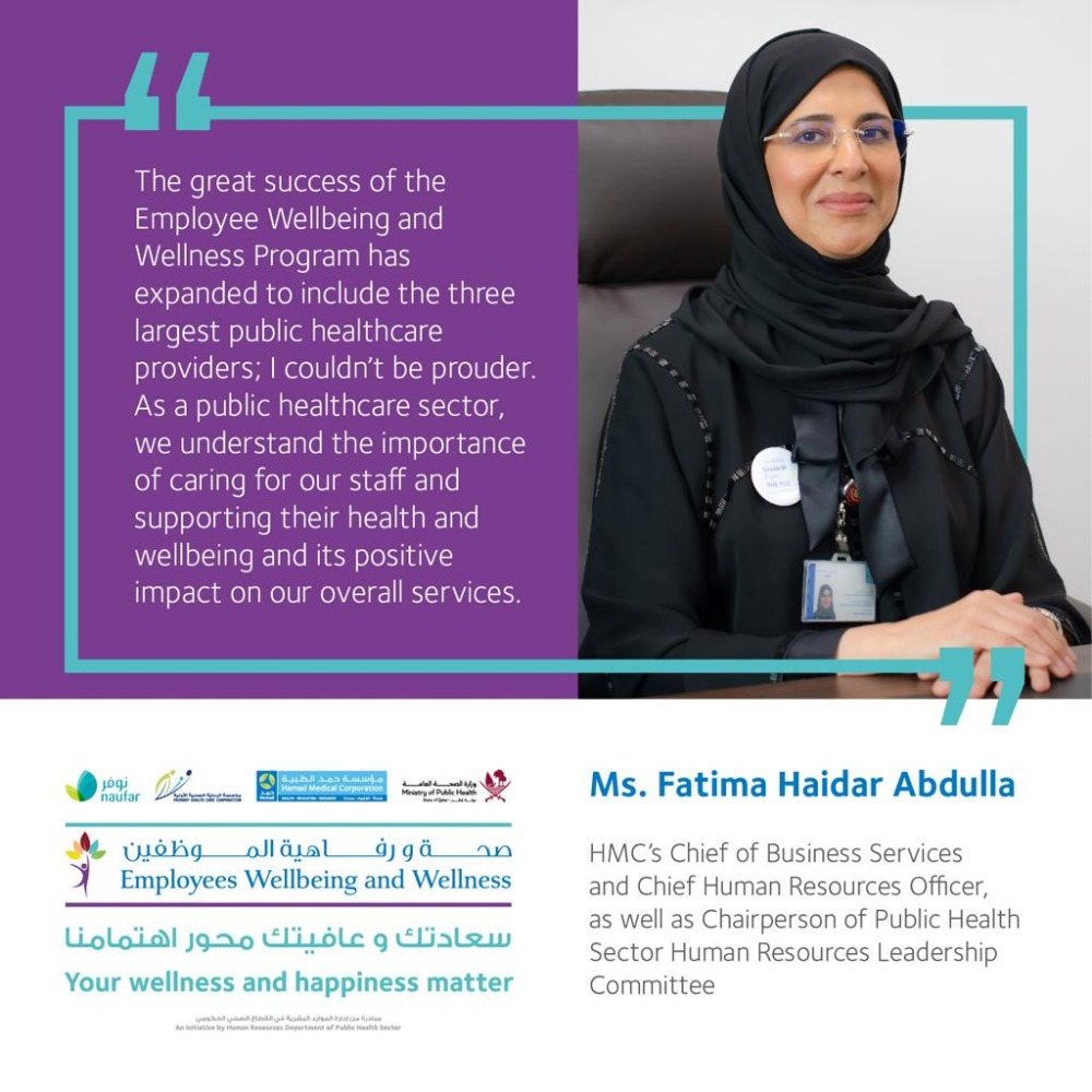 Fatima Haidar Abdulla, HMC’s Chief of Business Services and Chief Human Resources Officer, as well as Chairperson of Public Health Sector Human Resources Leadership Committee, said: “The great success of the Employee Wellbeing and Wellness Program has expanded to include the three largest public healthcare providers; I couldn’t be prouder.”