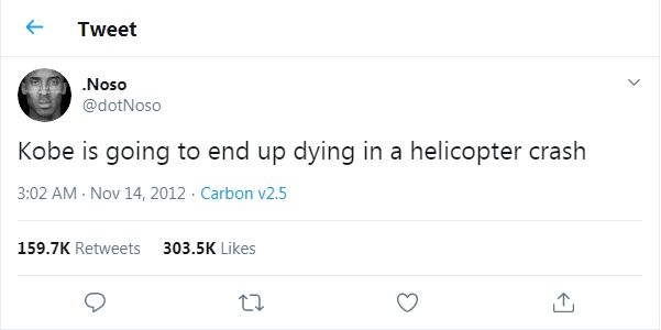 On November 24, 2012, a user named @dotNoso allegedly posted about the 18-time NBA All-Star basketball legend dying in a helicopter crash.