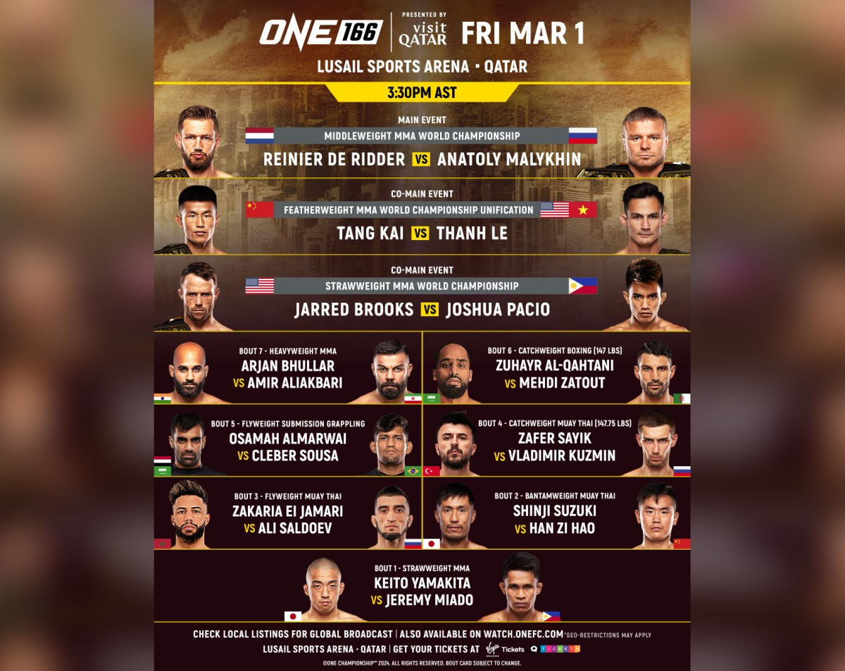 The One Championship taking place for the first time in Qatar will feature five fights across Mixed Martial Arts (MMA), Muay Thai, kickboxing, and submission grappling, leading up to the day’s showpiece event, a rematch between the undefeated ONE Heavyweight and Light Heavyweight MMA World Champion Anatoly Malykhin and the ‘Dutch Knight’ Reinier de Ridder for the ONE Middleweight MMA World Title.