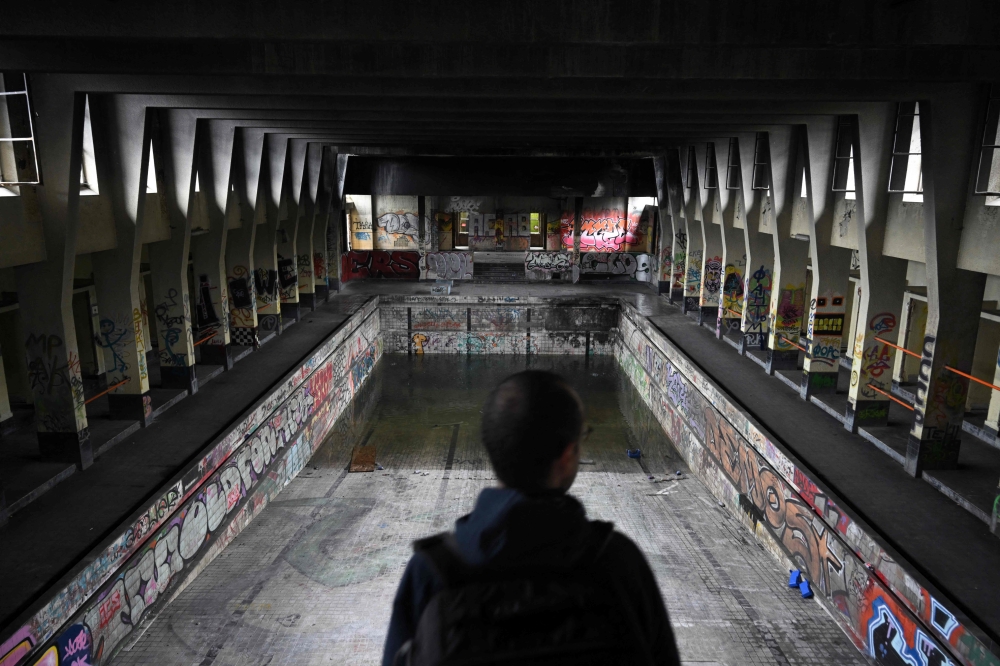 An urban explorer (urbex) scouts an abandoned public swimming pool in Charleroi, southern Belgium, on March 11, 2026. (Photo by Nicolas Tucat / AFP)
