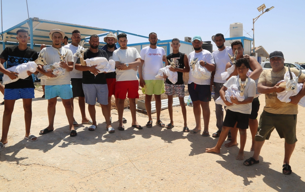 Local NGO activists from Bessida, hold three of the eight Rhim gazelles wrapped in protective blankets as they made ready for release on Farwa Island, off the Libyan coast of Abu Kammash, some 20 Km west of the Tunisian border on July 17, 2024. Eight young individuals, one male and 8 females, were released on Farwa Island, their new permanent home by Bessida, a local NGO active in environmental conservation and marine biodiversity protection. (Photo by Mahmud Turkia / AFP)