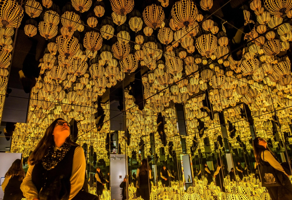 Kusama’s work, which uses extensive repetition of dots, strives for what she calls "self-obliteration.” Ironically, that same process has fueled her current omnipresencein art museums as her eye-popping - and impossibly photogenic - designs and patterns have become famous for boosting foot traffic.