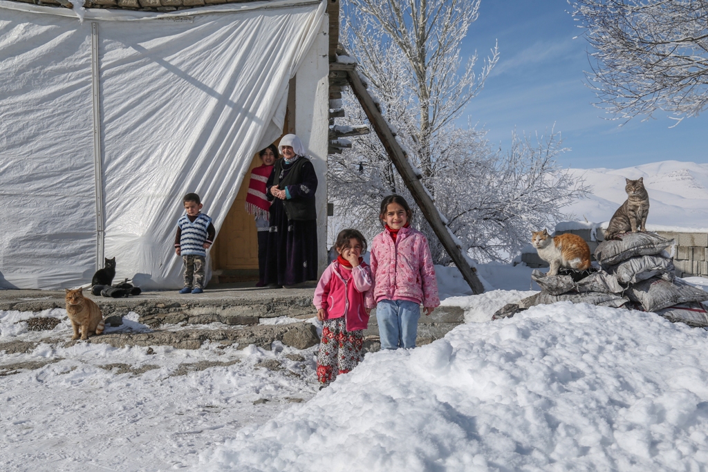 Children and cats stand in the snow outside a house in Gurpinar district of Van, Turkey on December 28, 2016. Özkan Bilgin - Anadolu Agency