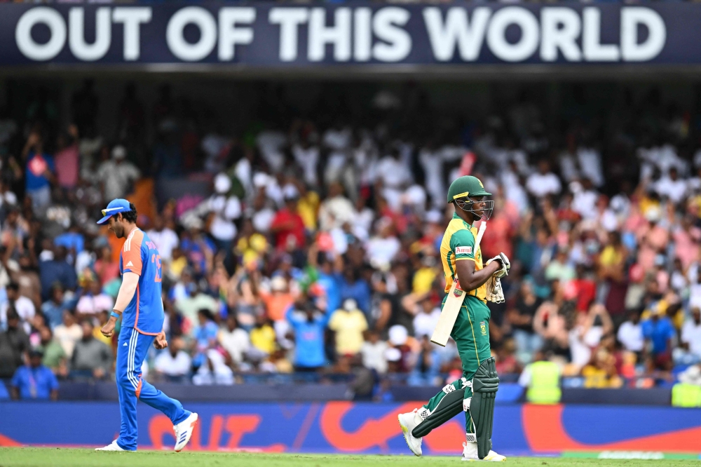 South Africa's Kagiso Rabada (R) walks back to the pavilion after his dismissal during the ICC men's Twenty20 World Cup 2024 final cricket match between India and South Africa at Kensington Oval in Bridgetown, Barbados, on June 29, 2024. (Photo by Chandan Khanna / AFP)