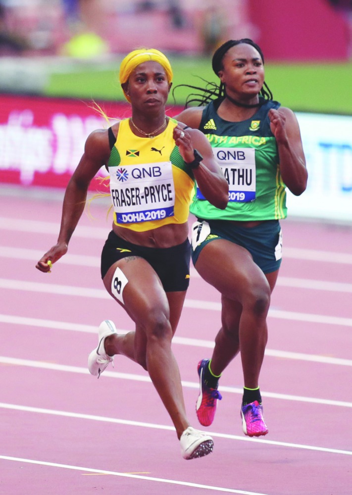 Jamaica's Shelly-Ann Fraser-Pryce in action with South Africa's Tebogo Mamathu during the women’s 100 metres heats.
