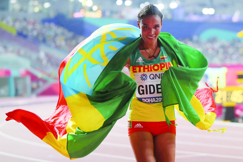 Ethiopia's Letesenbet Gidey celebrates with the national flag.