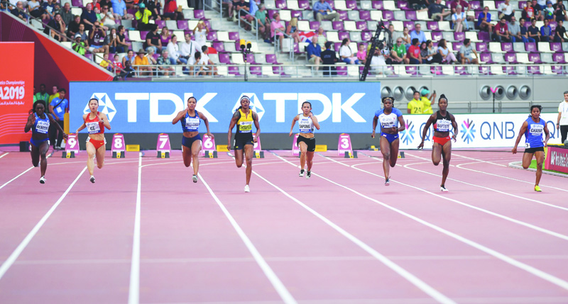 France's Orlann Ombissa-Dzangue (third left) and Jamaica's Elaine Thompson (fourth left) lead the way in the Women’s 100m heats. Pictures: Abdul Basit / The Peninsula