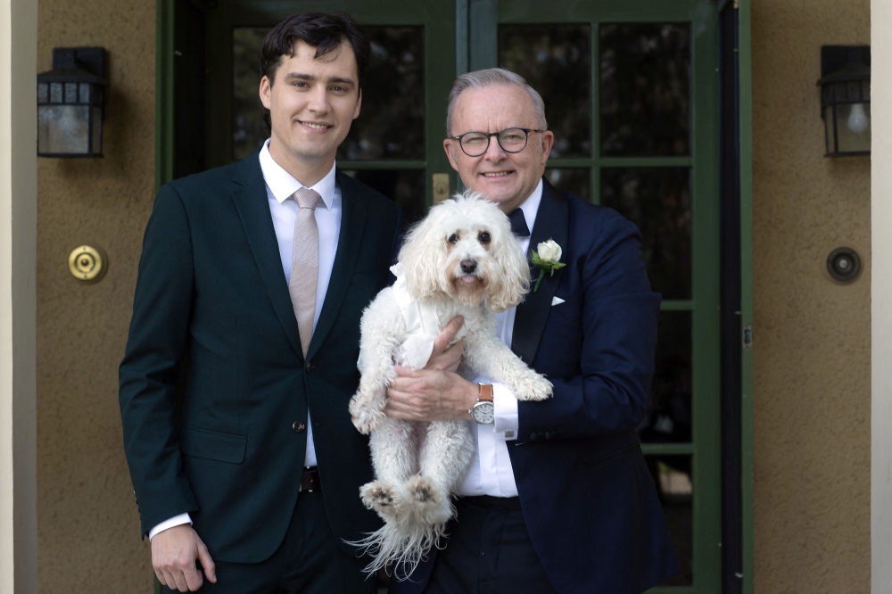 Australia's Prime Minister Anthony Albanese (R) with his son Nathan (L) and his dog and ring bearer named Toto, pose before the wedding ceremony with his new wife Jodie Haydon in Canberra on November 29, 2025. (Photo by Mike Bowers / AFP)