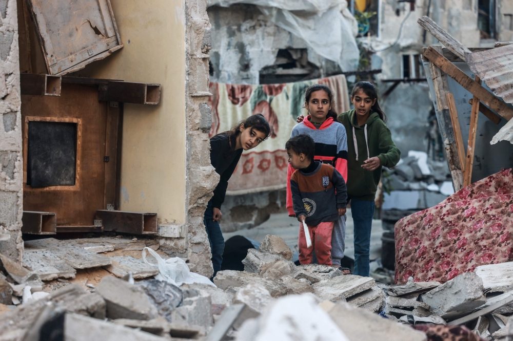 Children inspect the damage following Israeli bombardment in Rafah on the southern Gaza Strip on December 29, 2023. Photo by AFP