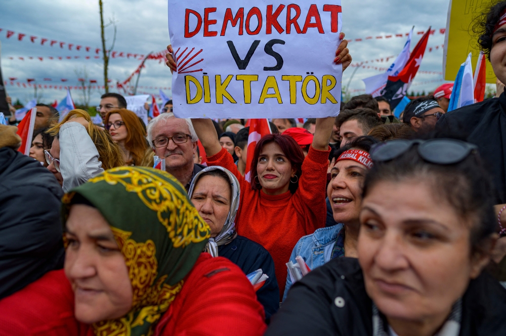 A Supporter holds up a sign reading "Democrat vs Dictator" during a rally in support of Republican People's Party (CHP) Chairman and Presidential candidate Kemal Kilicdaroglu in Kocaeli, on April 28, 2023. (Photo by Yasin Akgul / AFP)