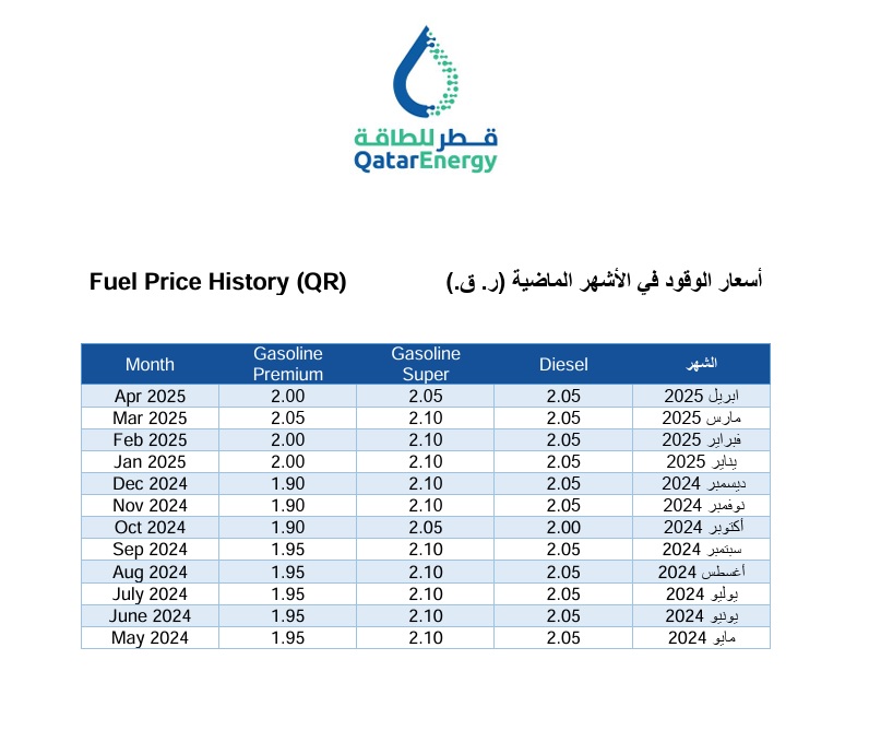 Doha, Qatar: QatarEnergy on Wednesday reduced the fuel prices for the month of May 2025. Super-grade petrol will cost QR1.95, compared to QR2.05 in April. Meanwhile, the Premium grade petrol will be QR1.90 in May, as compared to QR2 in April.