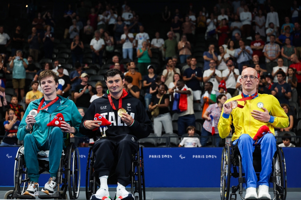 (From left) Silver medalist Neutral Paralympic Athletes' Kirill Pulver, gold medalist Italy's Francesco Bocciardo and bronze medalist Ukraine's Oleksandr Komarov celebrate on the podium of the men's 200m S5 freestyle swimming event during the Paris 2024 Paralympic Games at The Paris La Defense Arena in Nanterre, west of Paris on August 29, 2024. (Photo by Franck Fife / AFP)