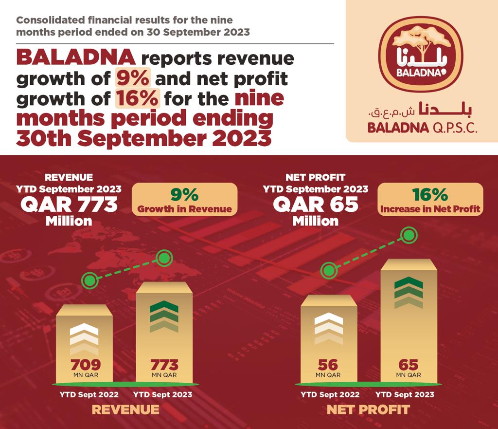 Doha, Qatar: Baladna Q.P.S.C. yesterday disclosed its interim results for the nine months period ending on 30th September 2023 showing strong growth in revenue and net profits compared to the same period last year.