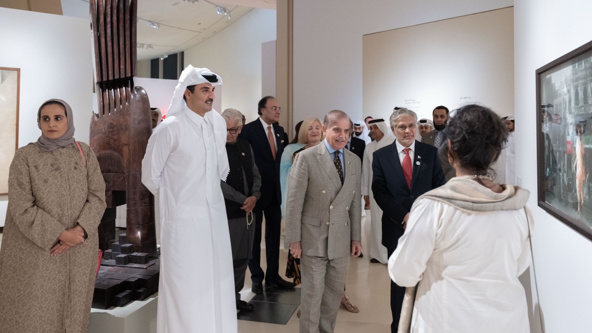 Doha, Qatar: The Amir His Highness Sheikh Tamim bin Hamad Al Thani and His Excellency Muhammad Shahbaz Sharif, Prime Minister of the Islamic Republic of Pakistan, today visited the exhibition “Art and Architecture in Pakistan from the 1940s to the Present” at the National Museum of Qatar.