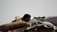 A Free Syrian Army fighter of the 101 Division takes a position behind sandbags near the town of Morek in the northern countryside...