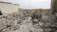 Residents inspect a site hit by what residents said were airstrikes carried out by the Russian air force in the town of Darat...