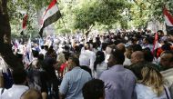 People, holding up Syrian flags, gather near the Russian embassy in Damascus. DAMASCUS: Two rockets struck the Russian embassy compound in Damascus on...